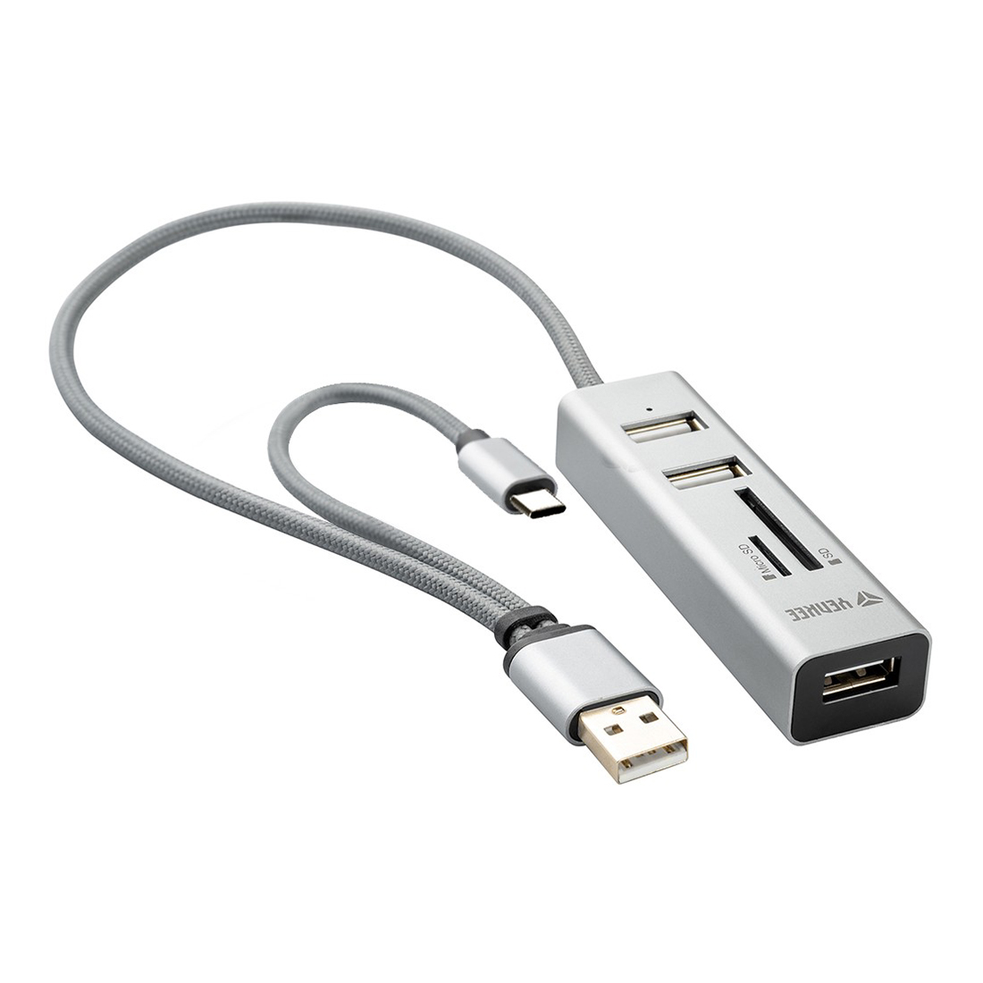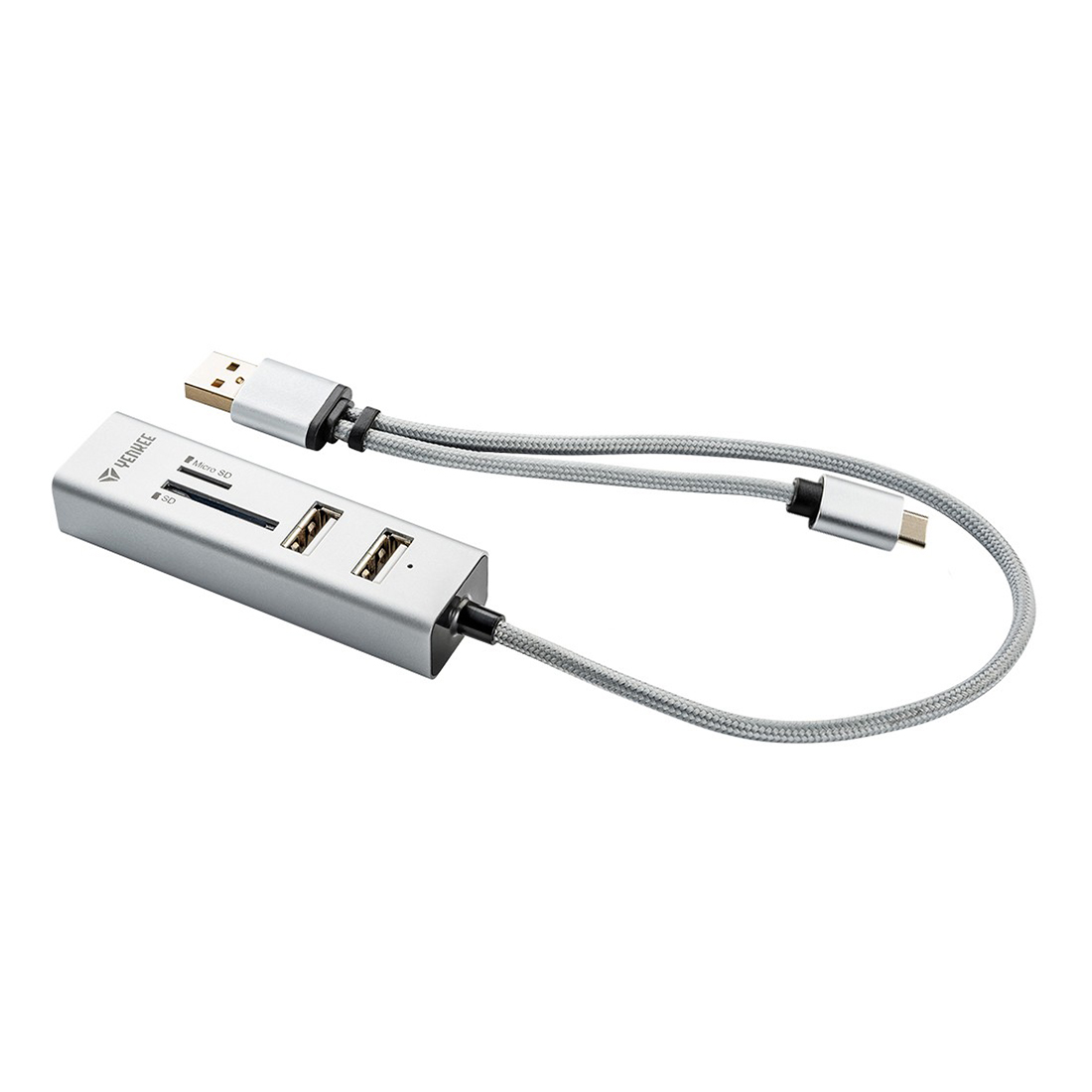 Stylowy adapter USB 2.0 łączący w sobie hub USB z czytnikiem kart, wraz z dodatkowym złączem USB C OTG dla urządzeń przenośnych.