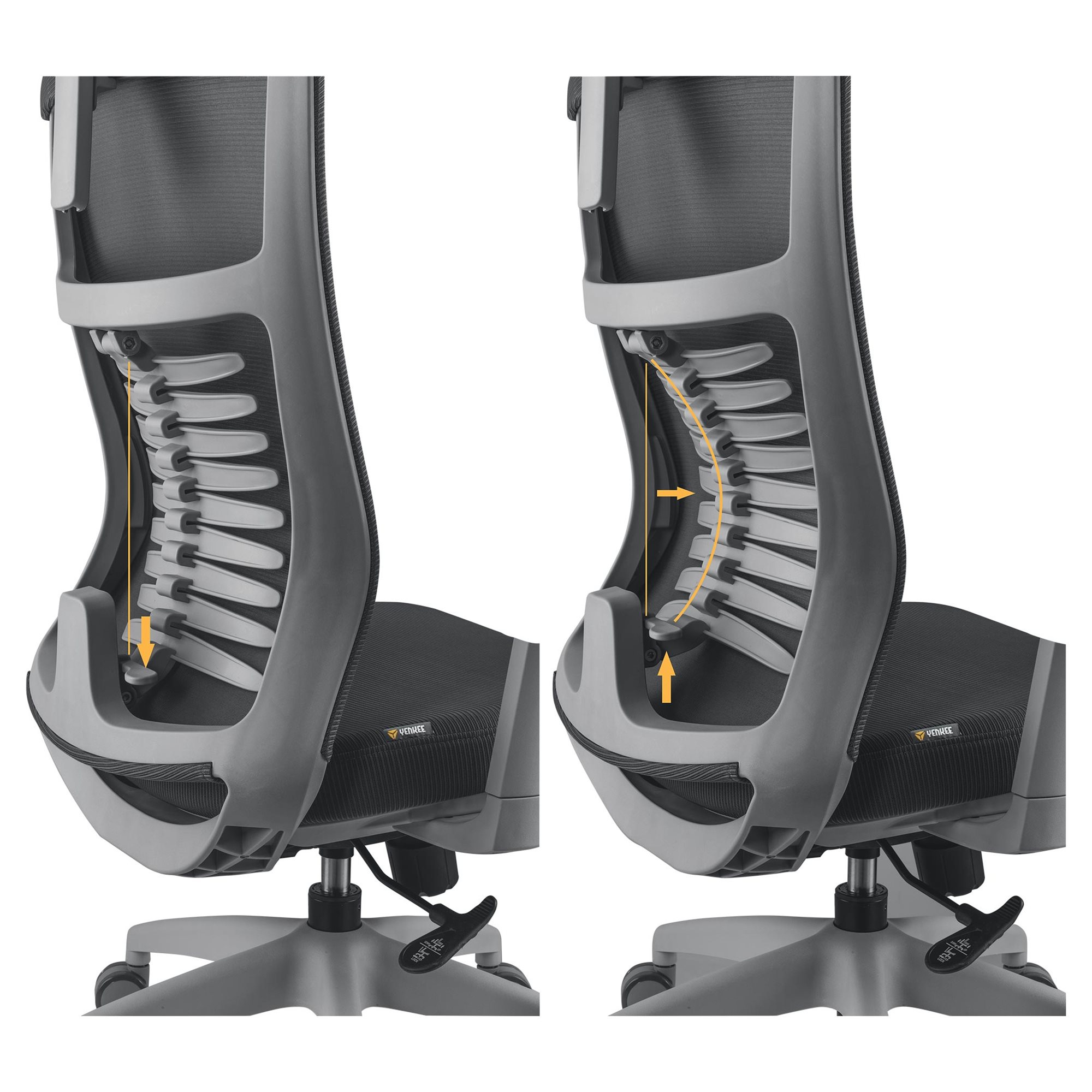 Nauka siedzenia jest bardzo ważna. W YENKEE jesteśmy świadomi, że kręgosłup lędźwiowy najbardziej cierpi z powodu długotrwałego i nieprawidłowego siedzenia. Nieprawidłowa postawa podczas siedzenia powoduje przede wszystkim bóle pleców, kręgosłupa i głowy. Dzięki unikalnej konstrukcji regulowanego podparcia lędźwiowego składającego się z 9 dwuskrzydłowych podpór pleców, uzyskasz właściwą postawę ciała. Podporządkowują się one kształtowi pleców i zapewniają 4 poziomy nacisku, wspierając kręgosłup i mięśnie pleców we wszystkich kierunkach. Z krzesłem biurowym FISHBONE nauczysz się prawidłowo i wygodnie siedzieć.