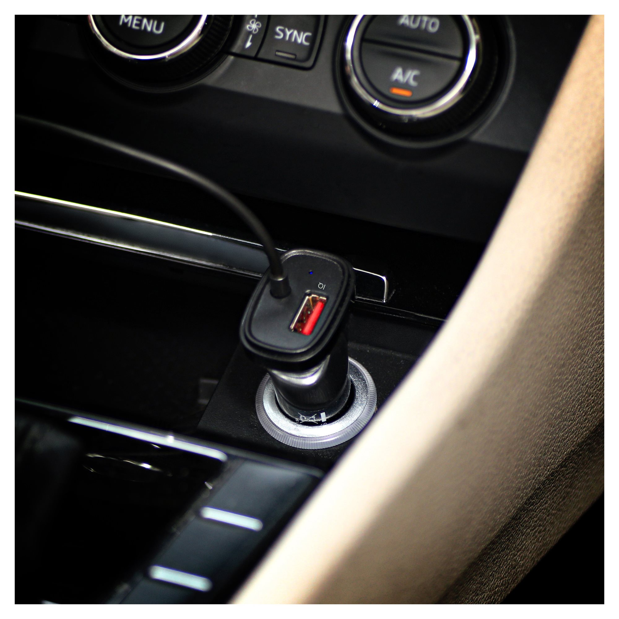 Ładowarka samochodowa ze zintegrowanym kablem USB C (max. 1,35 m) i dodatkowym portem USB. Kompatybilna z szeroką gamą urządzeń USB Typu C lub USB.