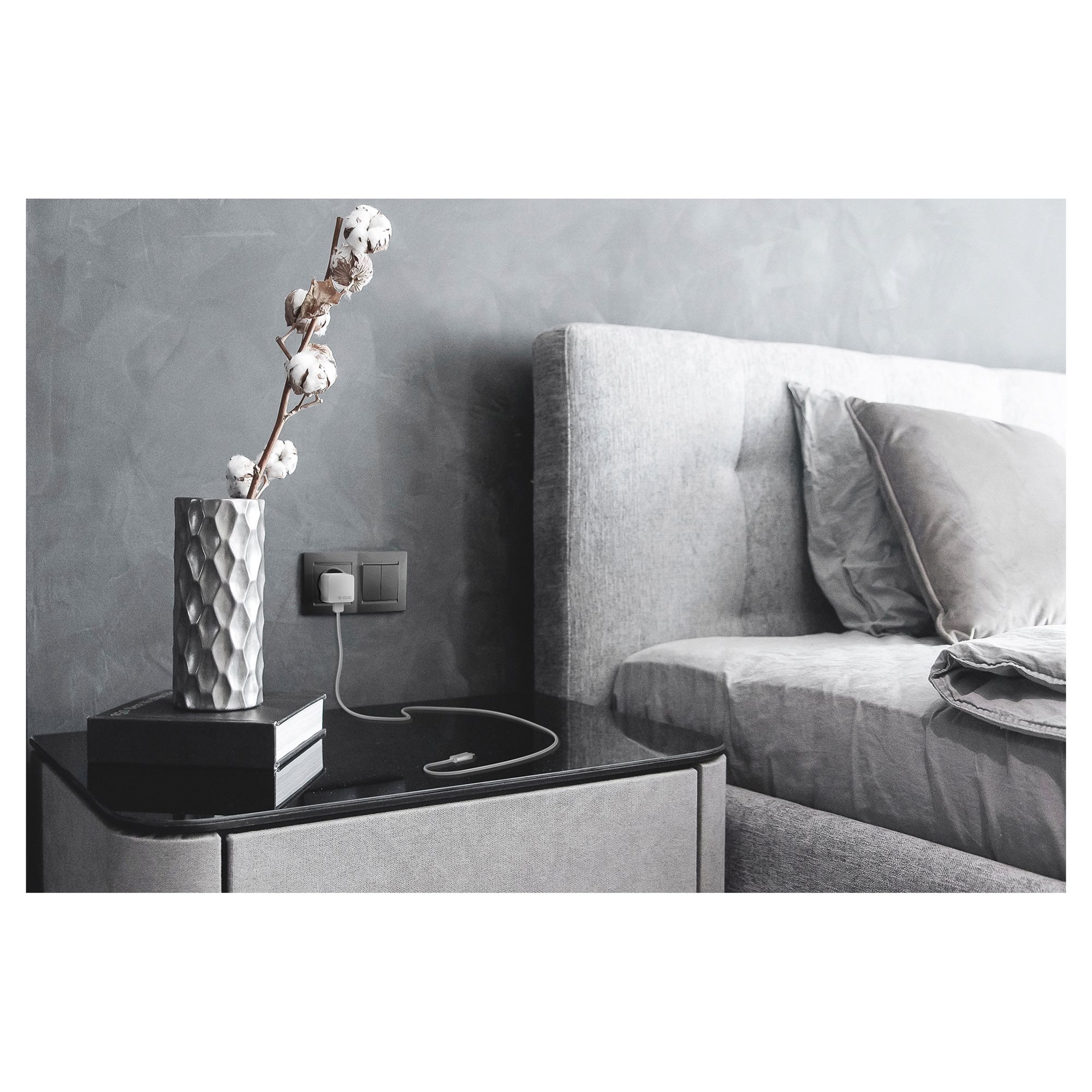 Dzięki specyficznemu kształtowi ładowarka nie rzuca się w oczy i można ją umieścić na przykład za szafką nocna.