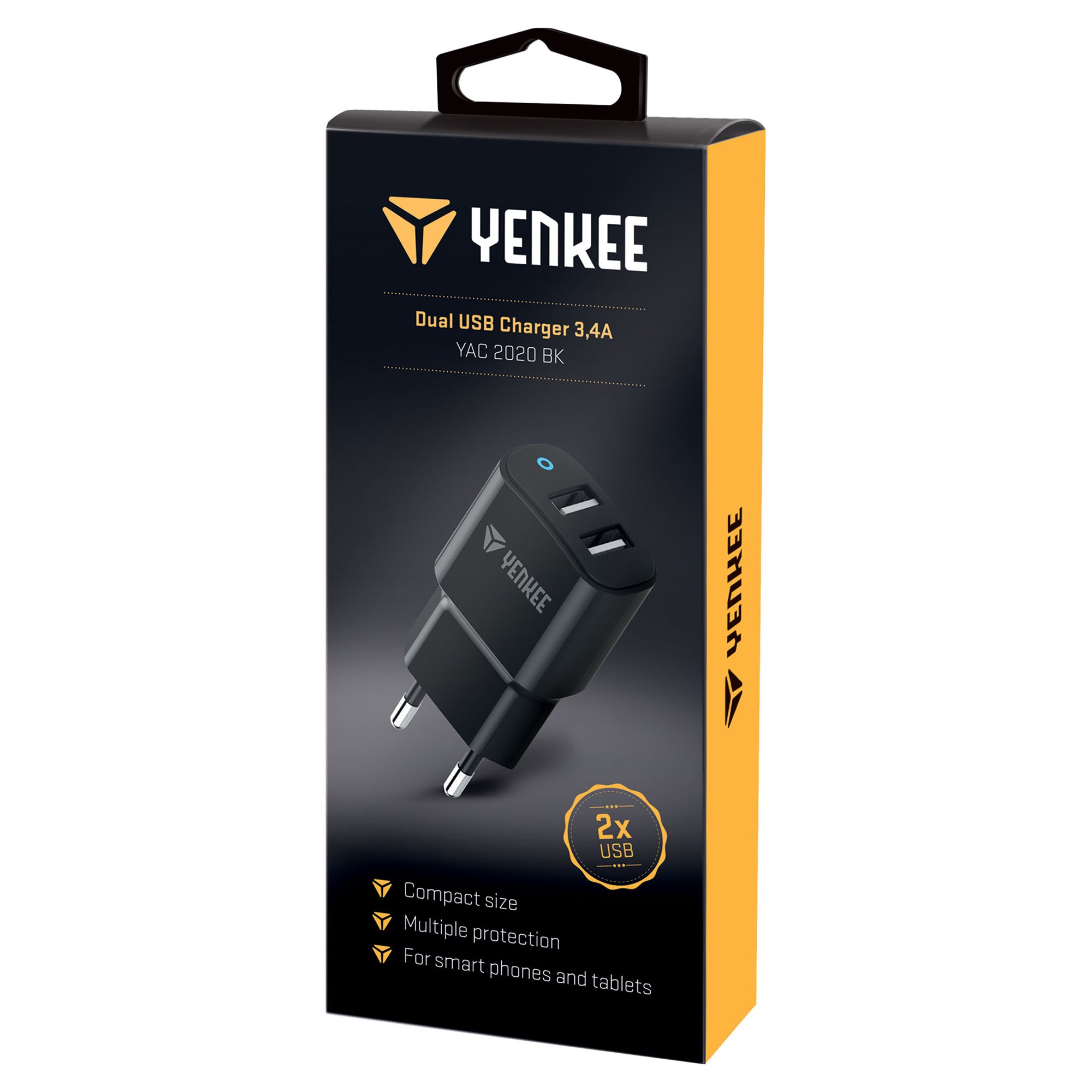 Podwójna ładowarka USB z wyjściem 3,4 A przeznaczona do telefonów komórkowych i tabletów. Dzięki niewielkiej masie i kompaktowym rozmiarom jest idealna w podróży lub jako ładowarka zapasowa. Dla zapewnienia maksymalnego bezpieczeństwa ładowarkę wyposażono w zwiększoną ochronę przed przepięciem, przeciążeniem, zapaleniem się i zwarciem.