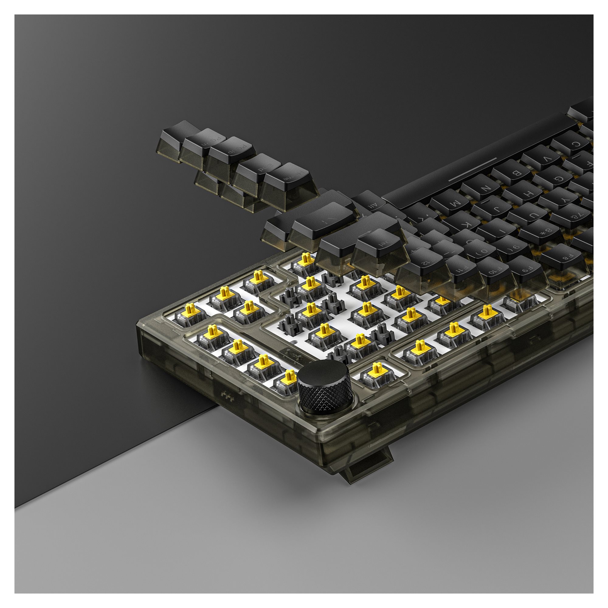 Poznaj uosobienie designu oszczędzającego miejsce - klawiaturę ODYSSEY z kompaktowym układem 75% korpusu. Ta klawiatura oferuje wydajność bez kompromisów i przesuwa granice funkcjonalności, jednocześnie oszczędzając cenne miejsce na biurku. Zaprojektowana, aby oferować wszystkie niezbędne funkcje klawiatury w mniejszej obudowie, ODYSSEY doskonale pasuje do nowoczesnych miejsc pracy, zakwaterowania dla studentów i kreatywnych przestrzeni. Ale innowacja to nie tylko rozmiar - przygotuj się na nieoczekiwane. Prawy górny róg jest ozdobiony starannie wykonanym metalowym sterownikiem, przywołującą poczucie wyrafinowanego smaku. Sterownik ten jest jednak czymś więcej niż tylko elementem wizualnym; umożliwia on również natychmiastowe sterowanie dźwiękiem. Sterowanie głośnością i odtwarzaniem/pauzą wzbogaca wrażenia multimedialne; wystarczy przekręcić lub nacisnąć ten element sterujący, aby sterować dźwiękiem. ODYSSEY nie tylko przyczynia się do porządku w miejscu pracy, ale także wnosi odrobinę elegancji, aby pobudzić ciekawość i na nowo zdefiniować funkcjonalność.