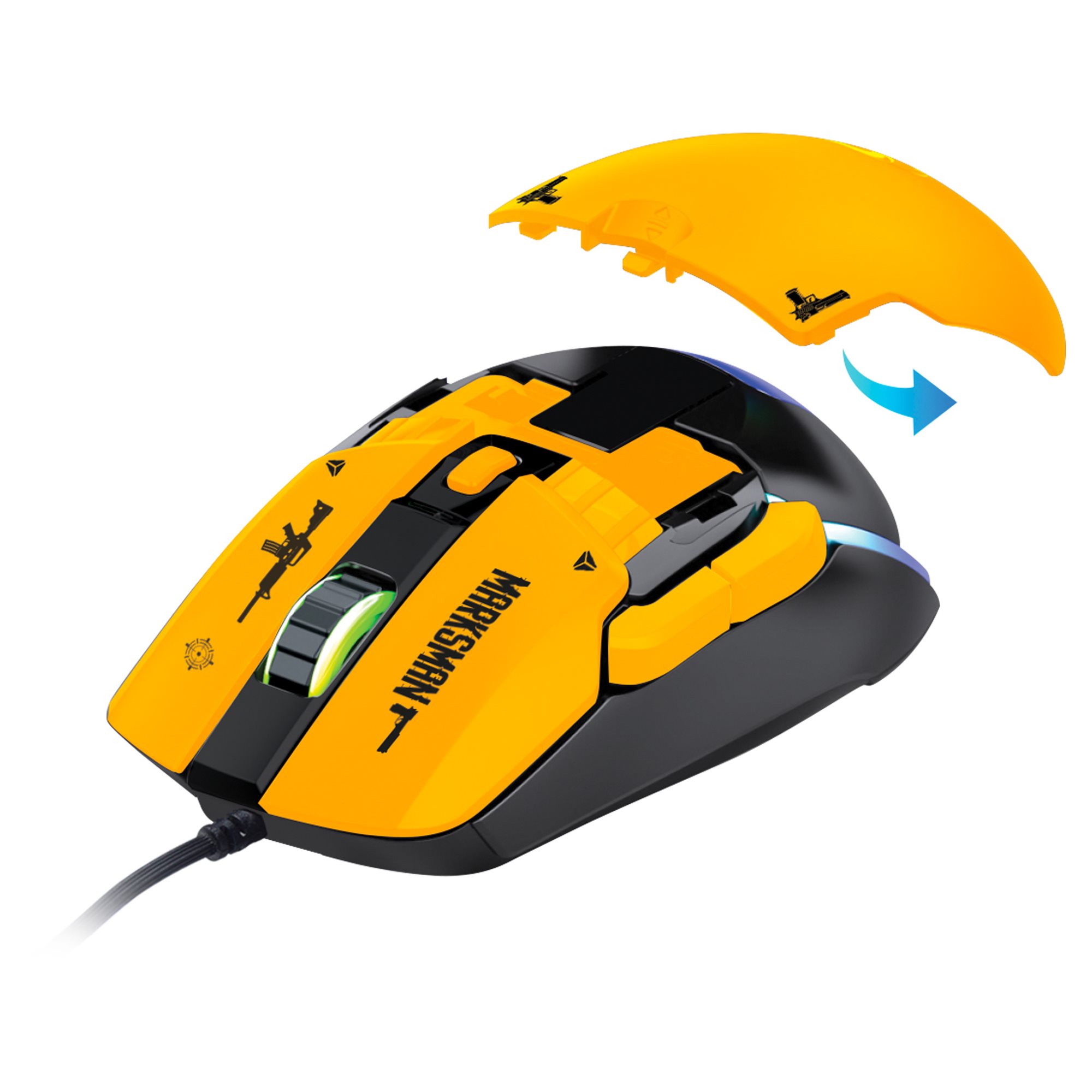 System modułowy umożliwia dostosowanie fizycznych elementów myszy. Oprócz wspomnianych przełączników, można wymieniać przednie i tylne panele. W zestawie z myszą gamingową MARKSMAN YENKEE YMS 3600YW dostaniesz dłuższy i krótszy wariant z kolorowym wzorem, możesz więc wypróbować, który bardziej pasuje do kształtu Twojej dłoni i osobistego stylu. Wykończenie powierzchni panelu częściowo zapobiega poceniu się, nie musisz się więc obawiać, że nadmierna wilgoć uszkodzi Twoją mysz. Graj do woli z modułową myszą gamingową MARKSMAN.