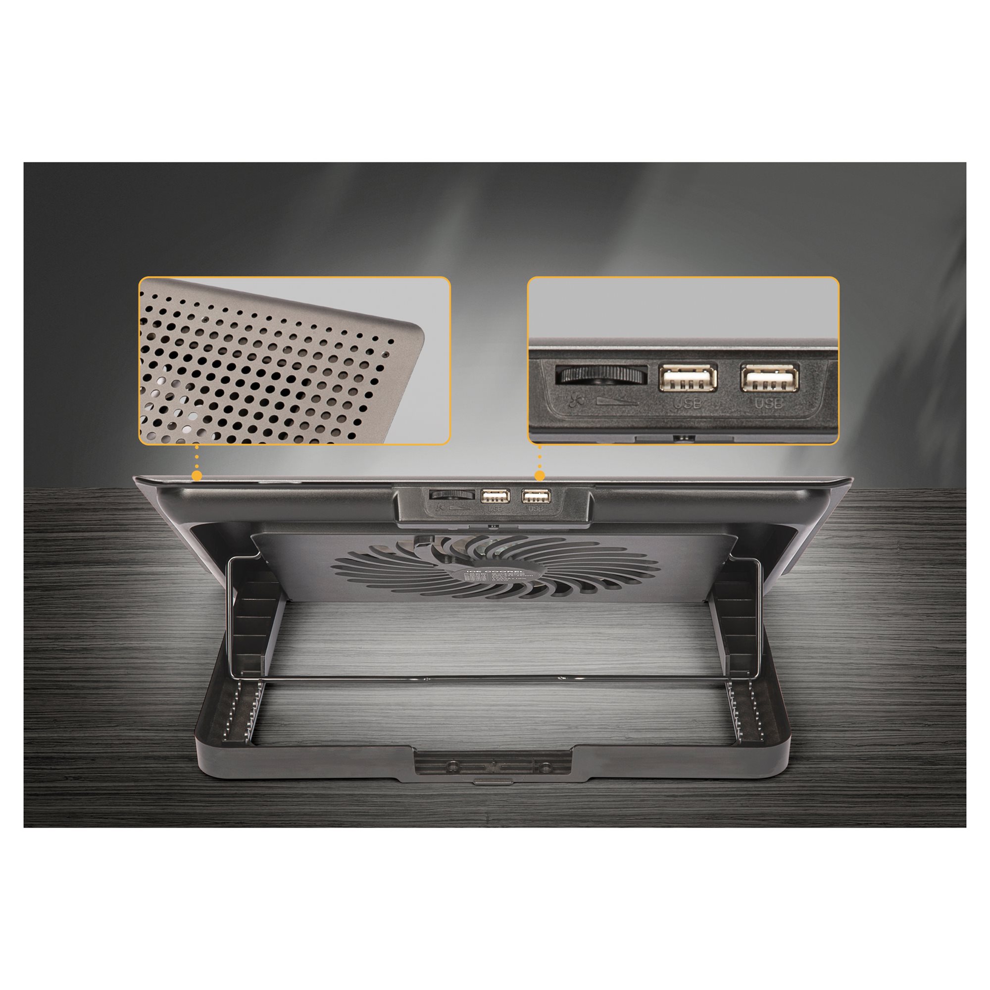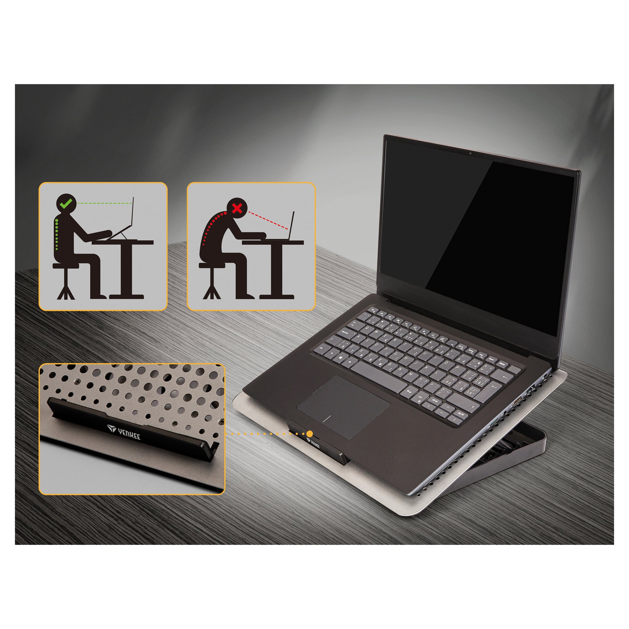 Mata YENKEE YSN 15 ma antypoślizgową powierzchnię. Gdy laptop jest podtrzymywany przez podkładkę chłodzącą, utrzymuje ona urządzenie w stabilnej pozycji. Ponadto wysokość podkładki można regulować w zakresie do 14,5 cm, dzięki czemu praca jest wygodniejsza, niezależnie od tego, czy jesteś w biurze, na wakacjach w egzotycznym kraju, czy na plaży przy ulubionym basenie. Odpocznij i nie martw się, ponieważ Twój komputer ma odpowiednie chłodzenie, aby chronić jego niezawodną wydajność.