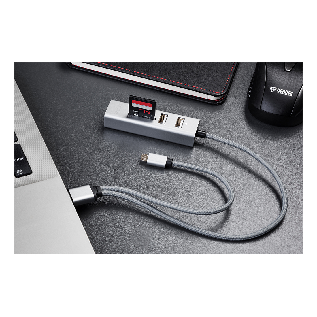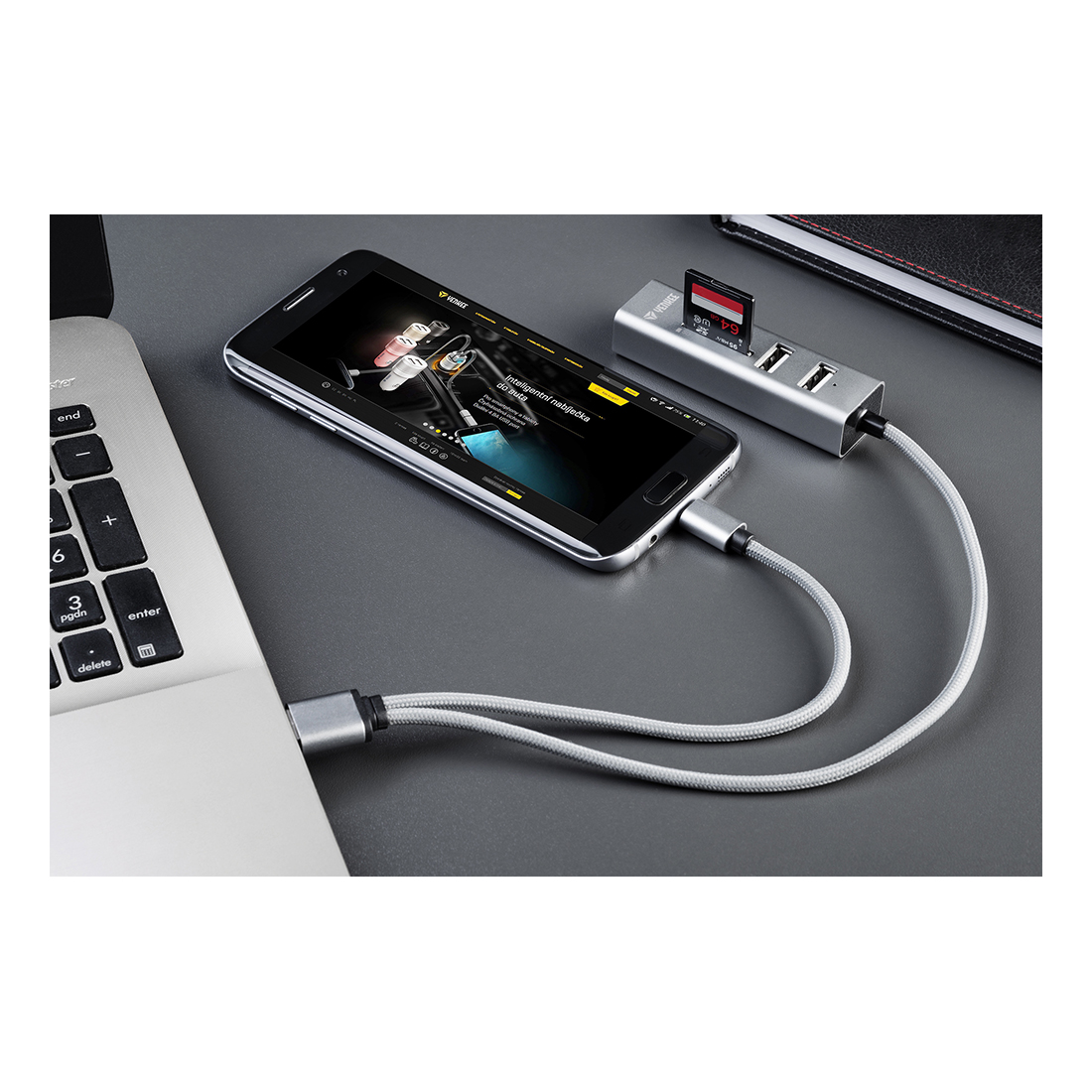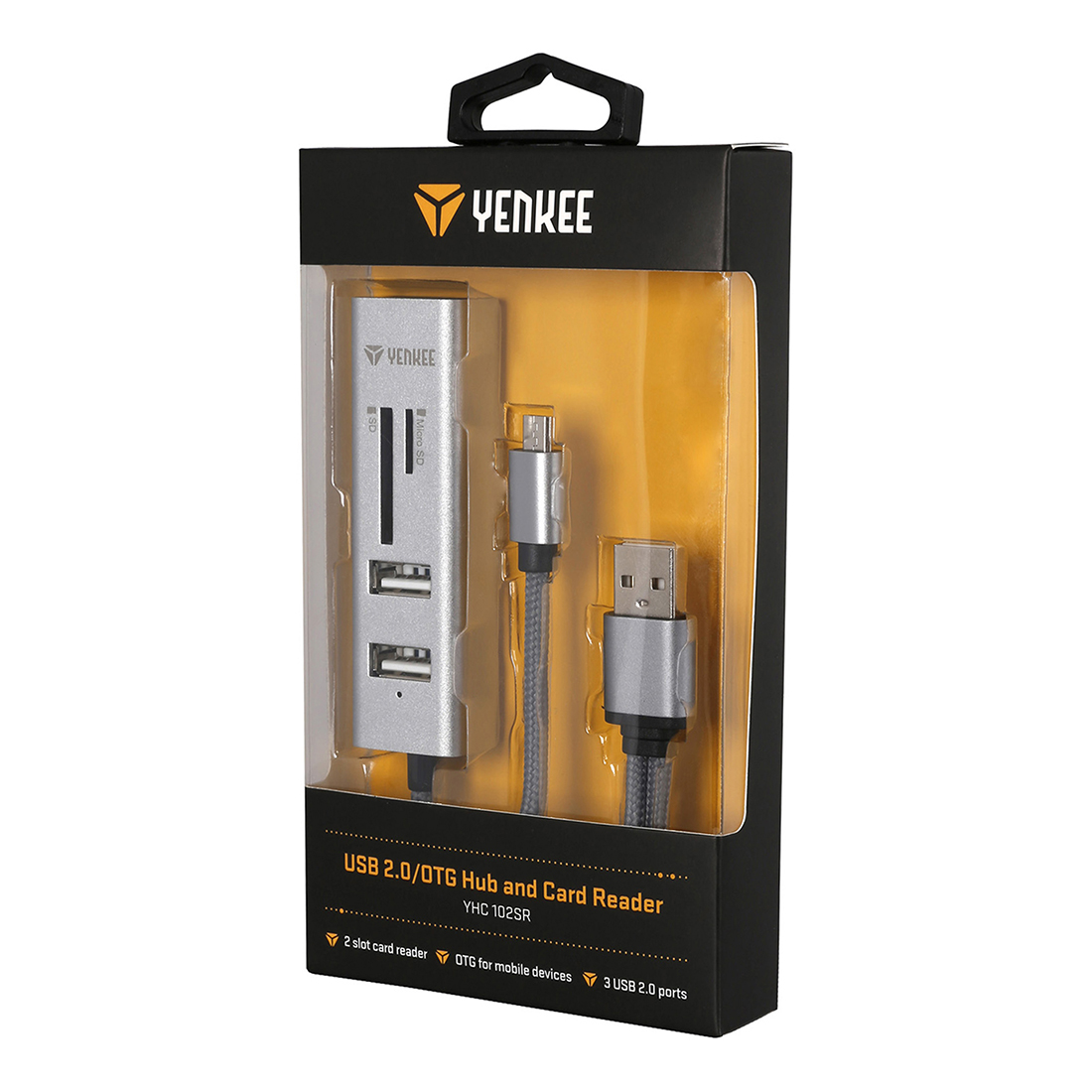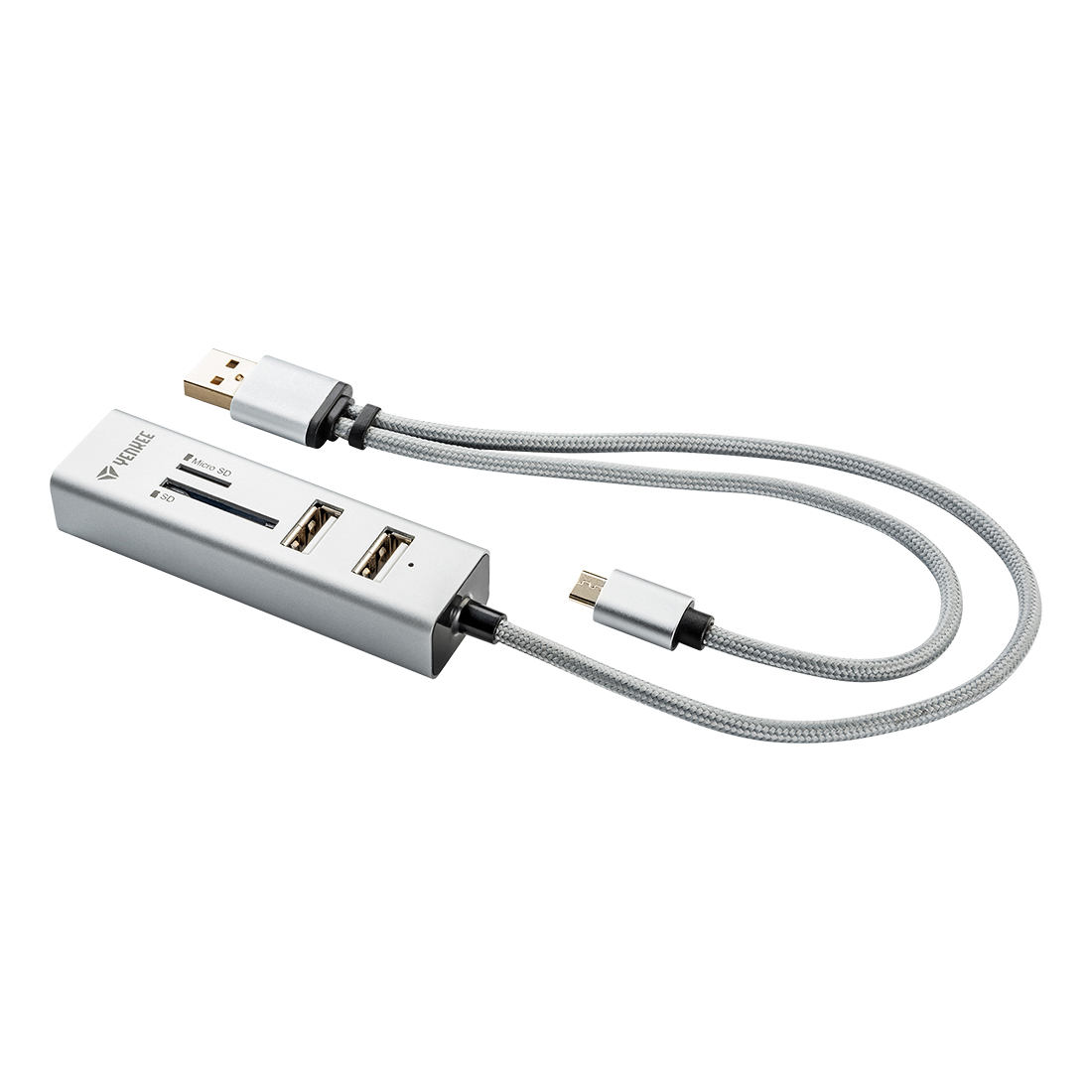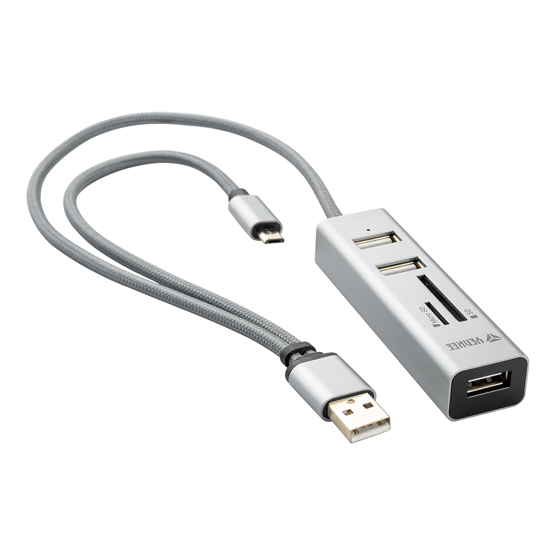 Stylowy adapter do USB 2.0 łączący rozdzielnik USB z czytnikiem kart włącznie z dodatkowym podłączeniem USB OTG Micro-B do urządzeń przenośnych.