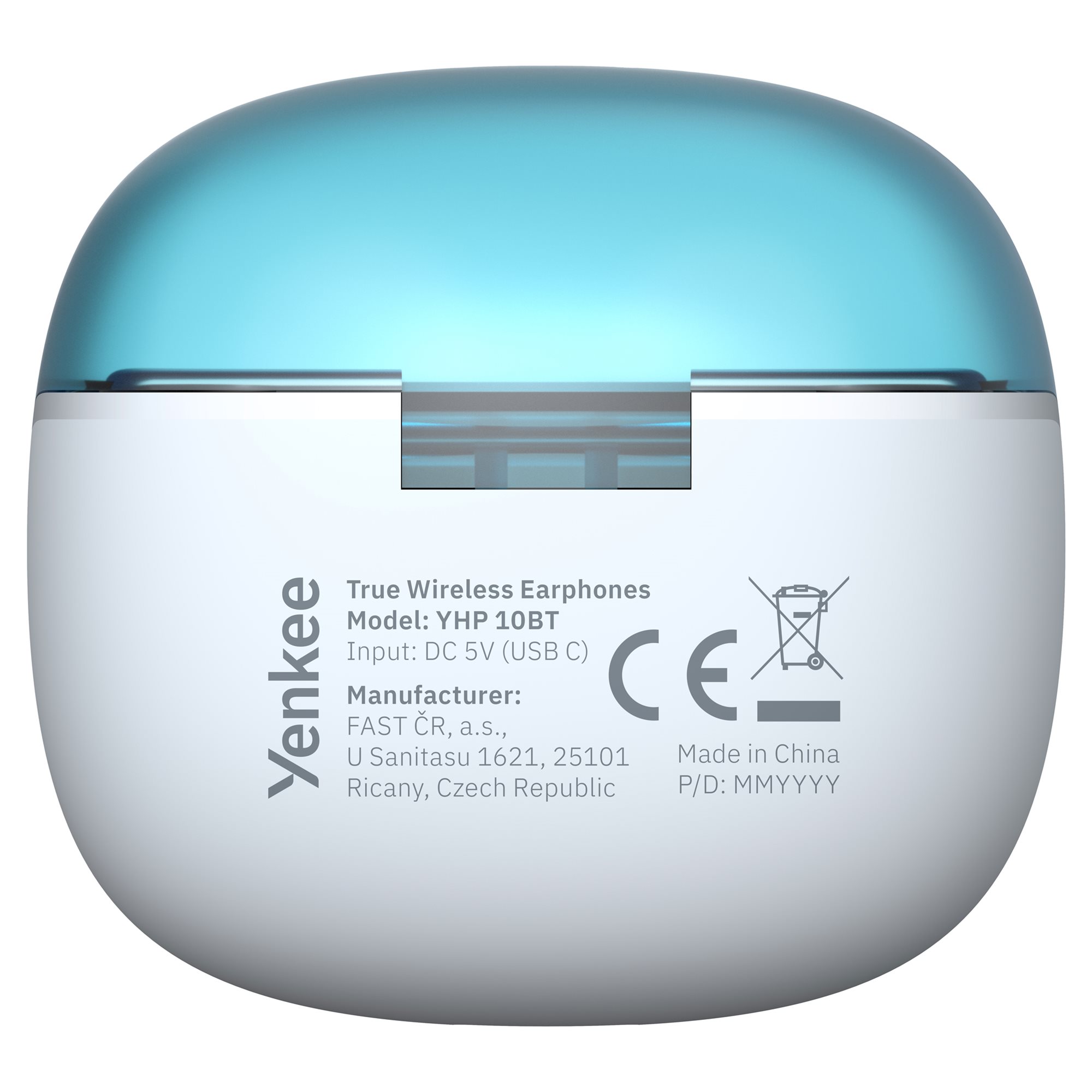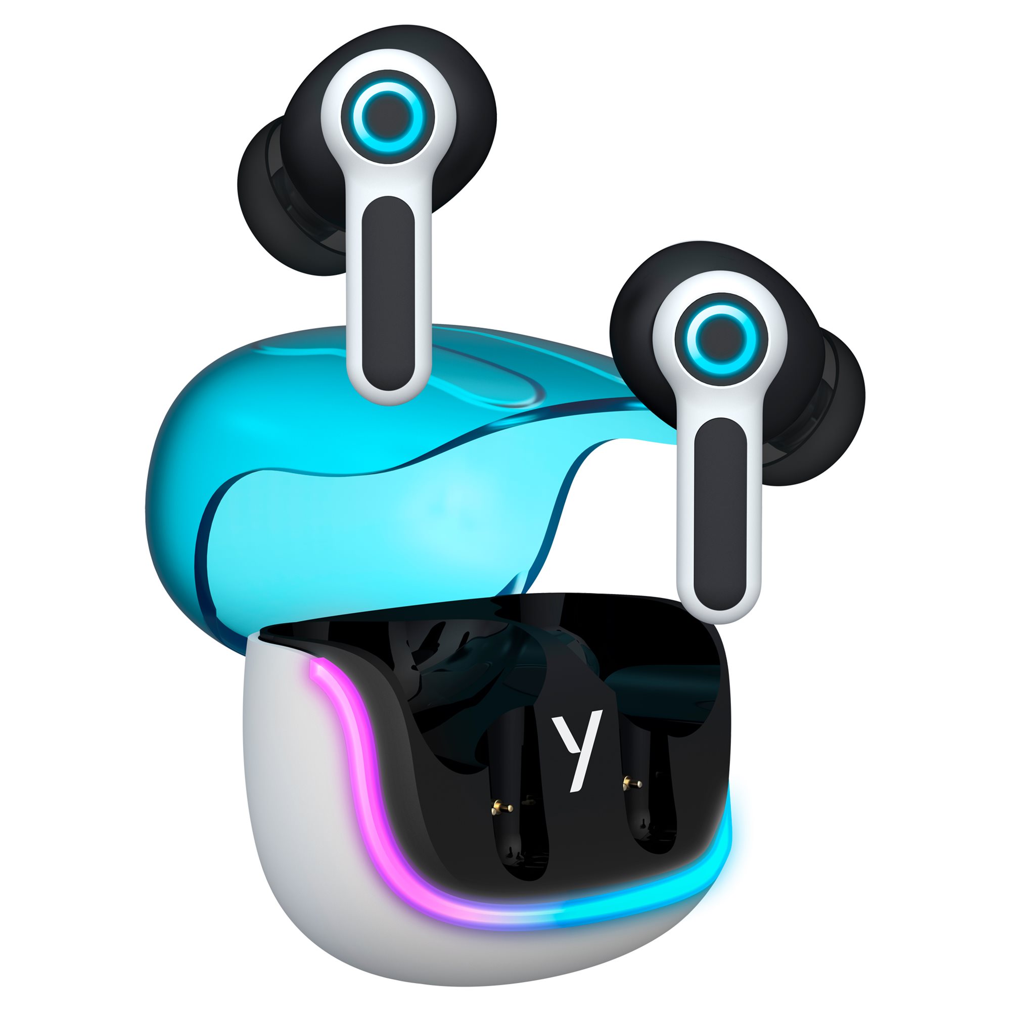 Białe etui z niebieskim otwarciem i czarnymi akcentami tworzy nowoczesny i elegancki wygląd. Kolorowe podświetlenie etui i niebieskie okrągłe podświetlenie słuchawek dodają futurystycznego akcentu, podkreślając ich stylowy design i nadając im wyjątkowy charakter.