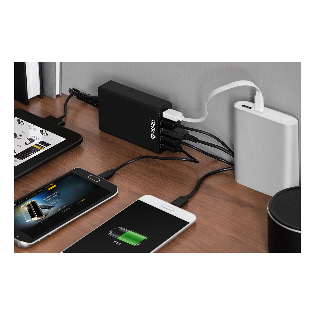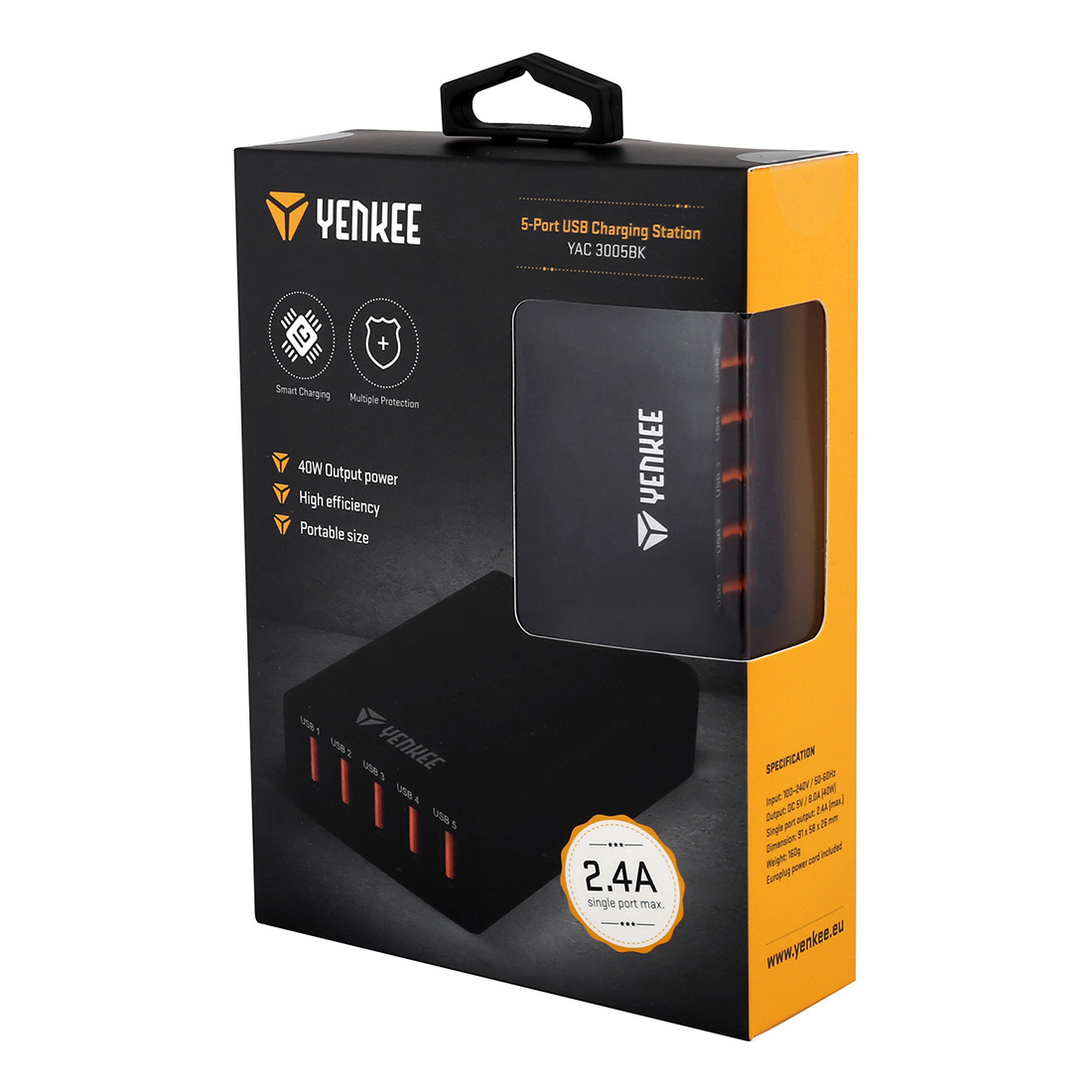 Stacja ładująca na 5 portów USB posiada łączną moc wyjściową 40W/8A i umożliwia jednoczesne ładowanie kilku urządzeń. Optymalne ładowanie zagwarantowane jest przy pomocy wbudowanego inteligentnego wykrywania urządzeń a na jednym porcie do dyspozycji jest max. prąd wyjściowy 2,4 A.
