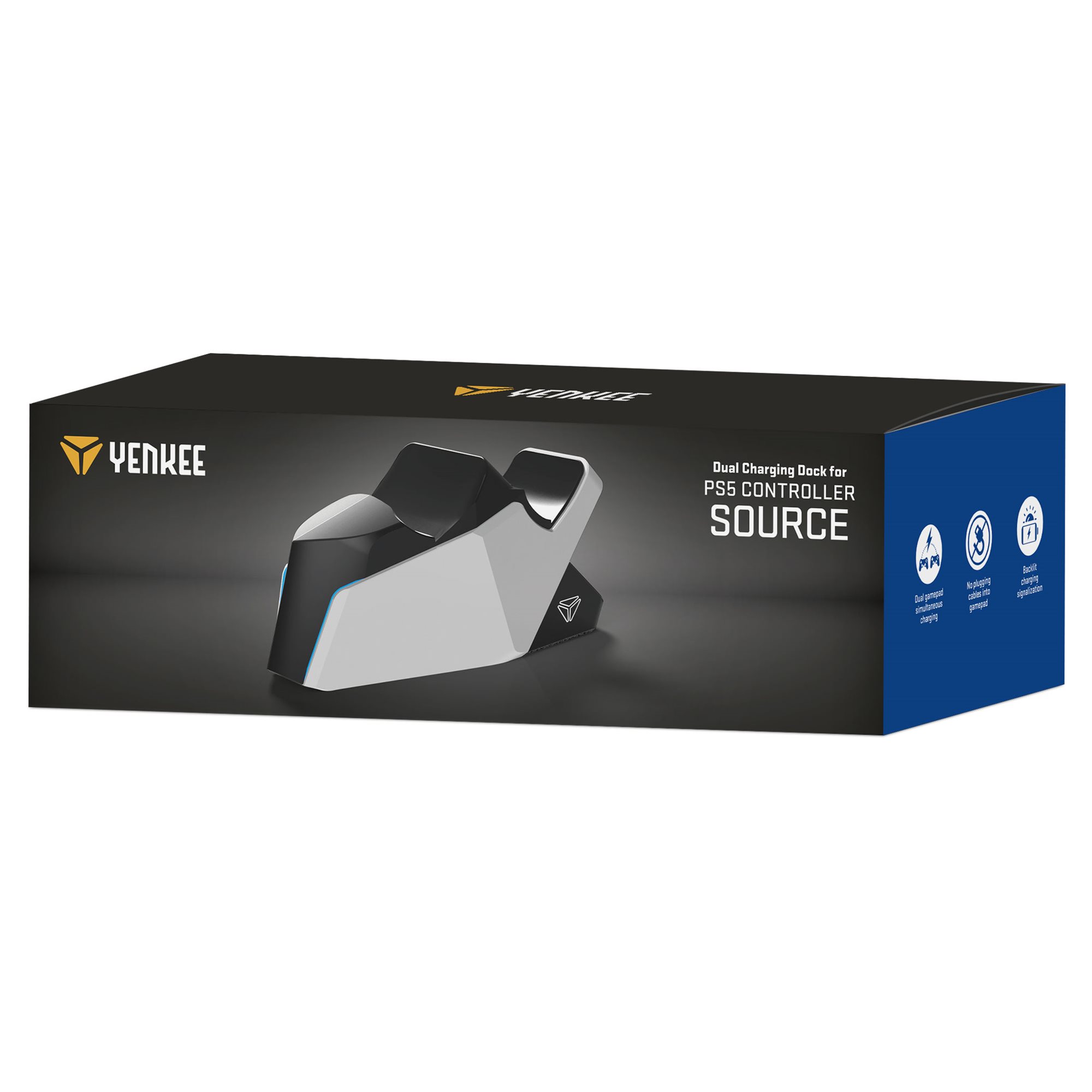 Stacja ładująca SOURCE umożliwia jednoczesne ładowanie dwóch kontrolerów PS5, sygnalizując ich poziom naładowania za pomocą diod LED.