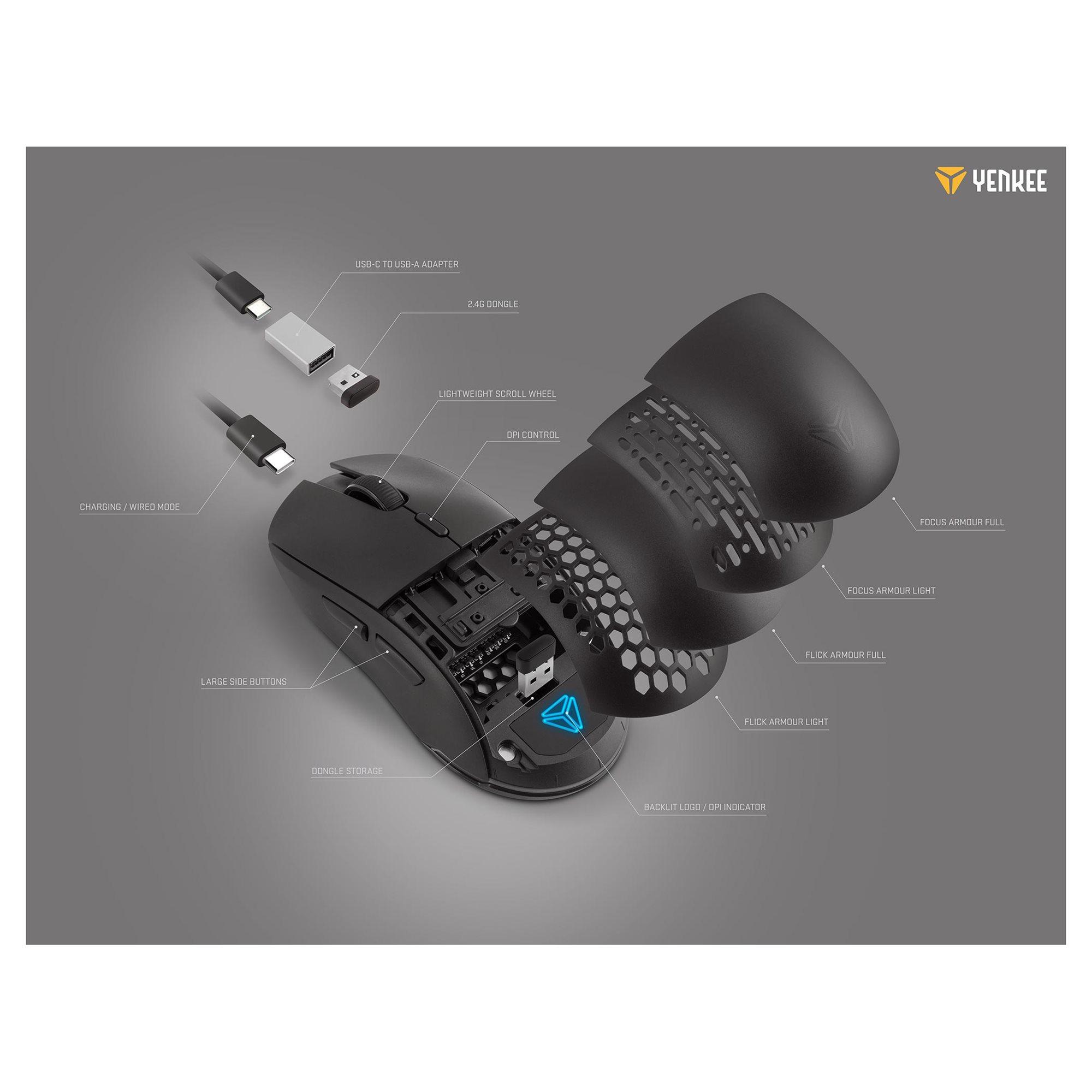 Mysz bezprzewodowa SWIPE wygodnie komunikuje się z komputerem za pomocą odbiornika 2,4 GHz, dzięki czemu reakcje są praktycznie natychmiastowe. Pożegnaj się na zawsze z przewodowymi myszami i doświadcz relaksującej wolności podczas grania w ulubione gry. Zintegrowany akumulator o pojemności 300 mAh gwarantuje do 44 godzin ciągłego użytkowania. Dla graczy szukających bardziej tradycyjnej konfiguracji możliwe jest korzystanie z myszy z nowoczesnym złączem USB-C, które znajdziemy w pudełku, wraz z reduktorem USB-A.