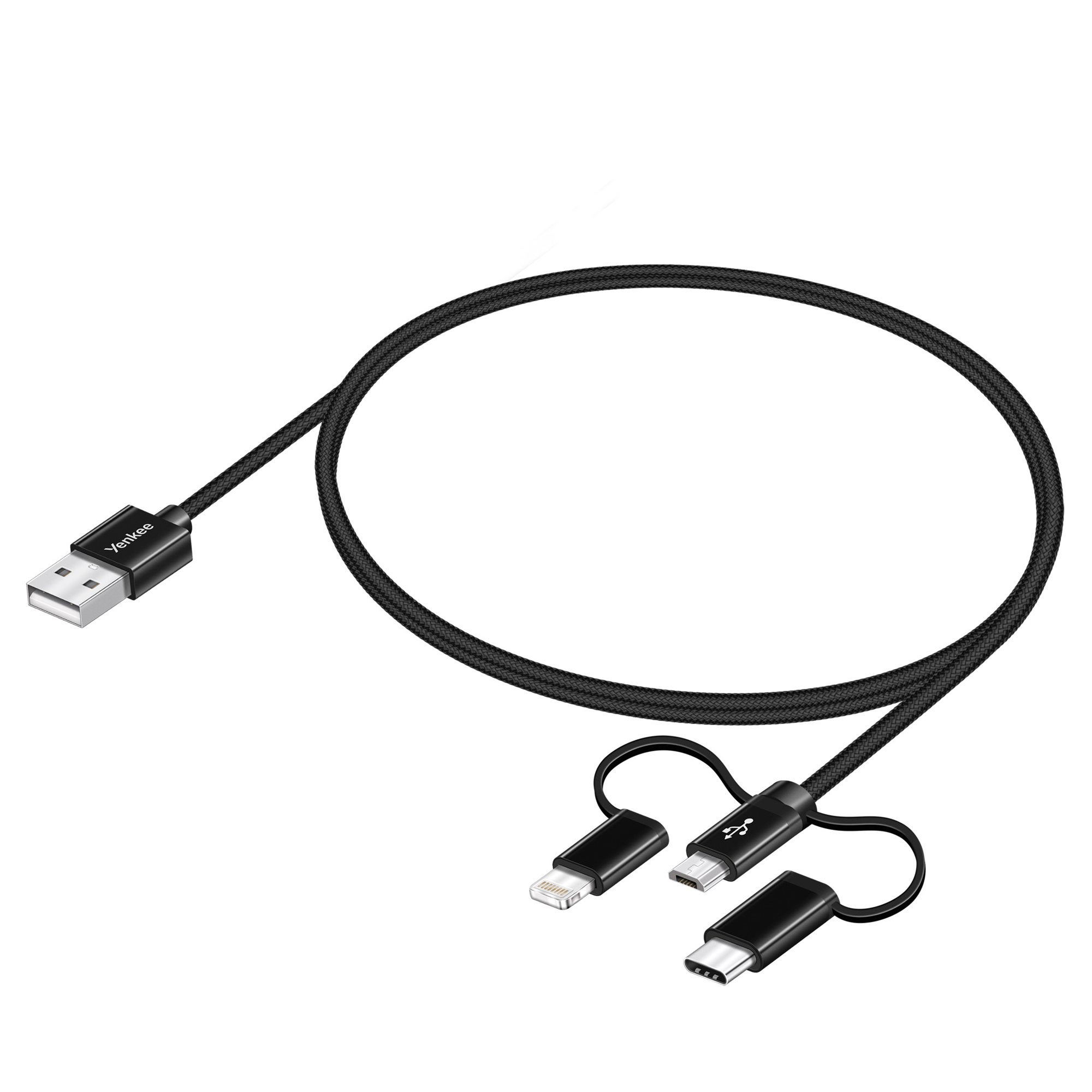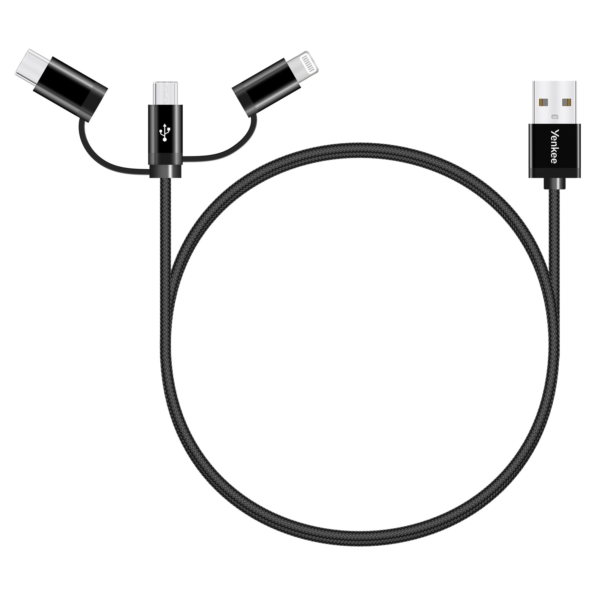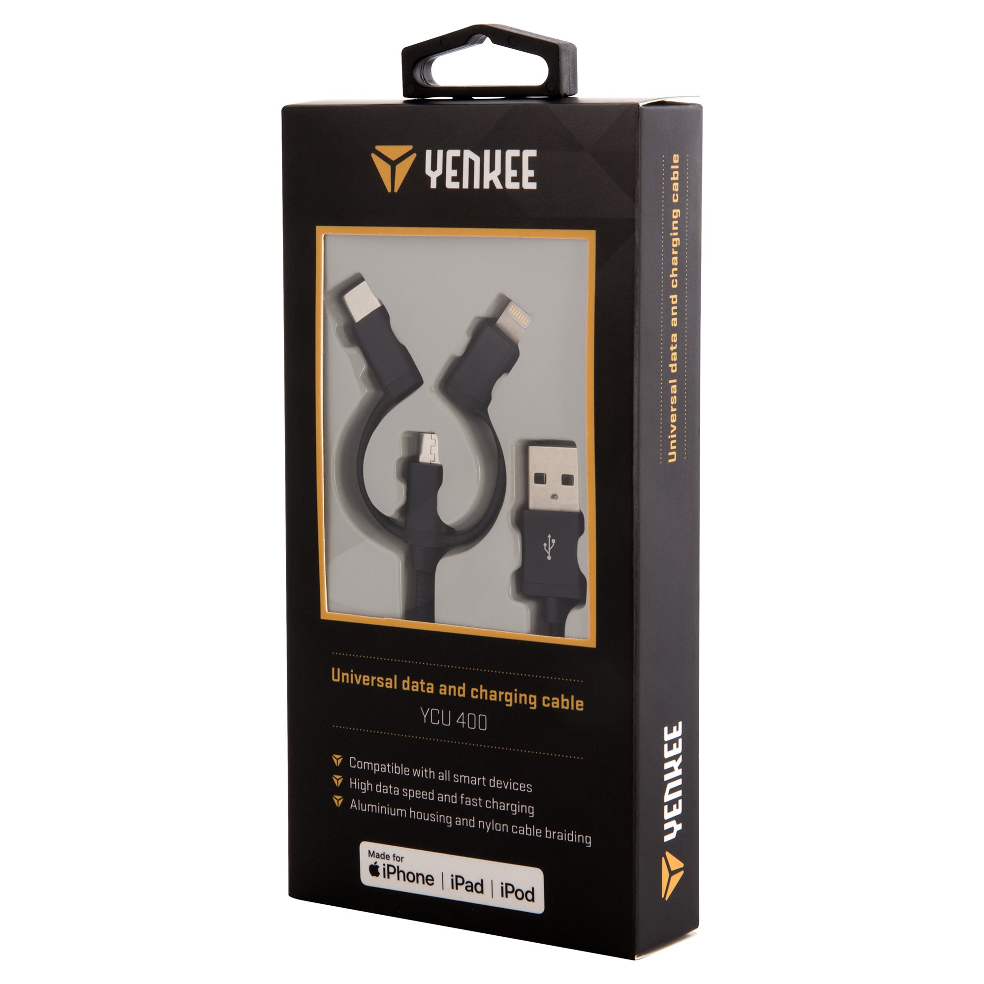 Uniwersalny kabel do transferu danych i ładowania odpowiedni do wszystkich typów urządzeń smart obsługuje szybkie ładowanie i wysoką prędkość transferu. Dzięki złączu 3 w 1 kabel jest idealny do samochodu, w podróży lub gdziekolwiek, gdzie będzie trzeba podłączyć różne typy urządzeń smart. Kabel wyposażony jest w złącze Micro USB, USB C i certyfikowane złącze Lightning.