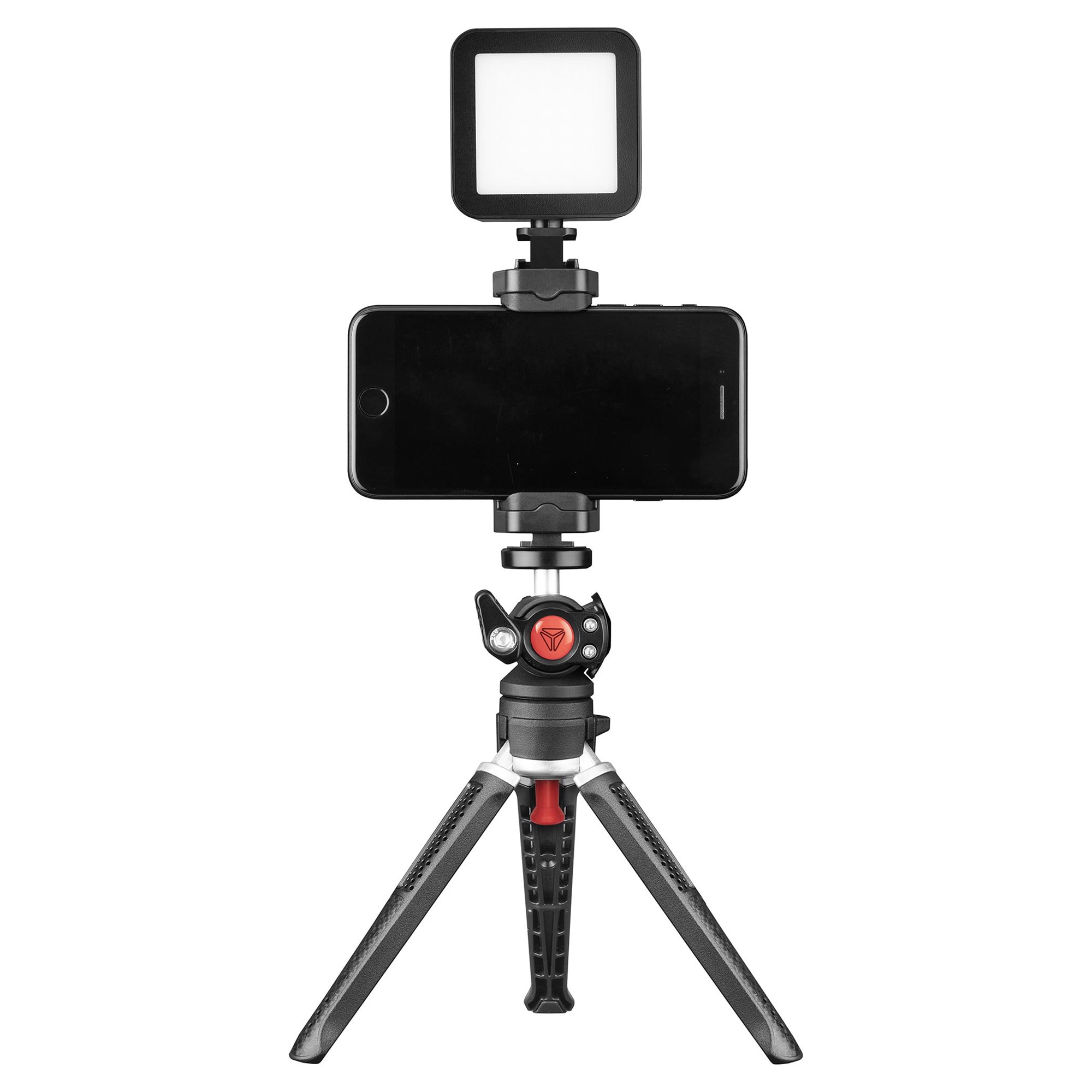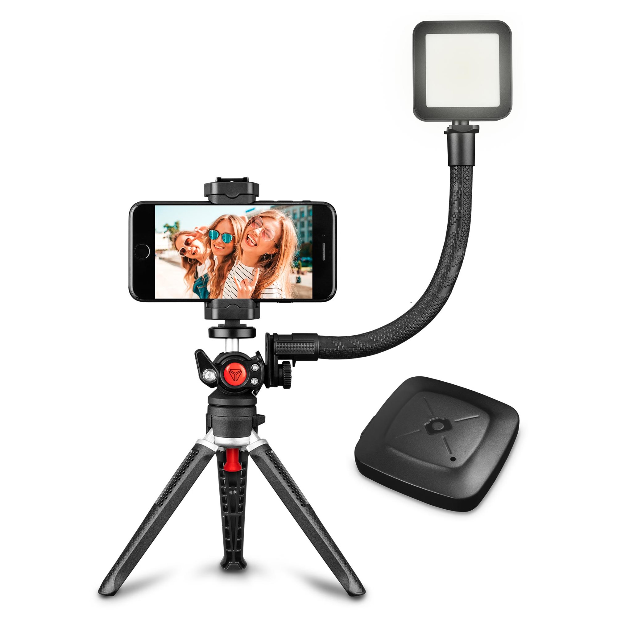 Nie składaj swojego wyposażenia z różnych komponentów, które do siebie nie pasują. Jestem uniwersalnym zestawem do vlogowania, który ma wszystko, czego potrzebujesz, by tworzyć doskonałe widea i zdjęcia. Stoję na solidnej podstawie mojego statywu, moje światło LED sprawia, że podczas pracy promieniejesz, a ja zawsze mocno trzymam Twój sprzęt. Krótko mówiąc, jestem świetnym partnerem w domu i w podróży.