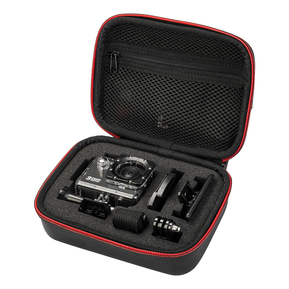 Uniwersalny futerał podróżny na kamerę sportową i akcesoria. Kieszeń z delikatną pianką zapewnia optymalną ochronę kamery, podstawowych uchwytów i akcesoriów. Kieszenie z siatką i zamkiem są doskonałym miejscem na mniejsze akcesoria, takie jak kable, karty pamięci itp. Część wnętrza można wyjąć i wykorzystać futerał na inne urządzenia podobnych rozmiarów.