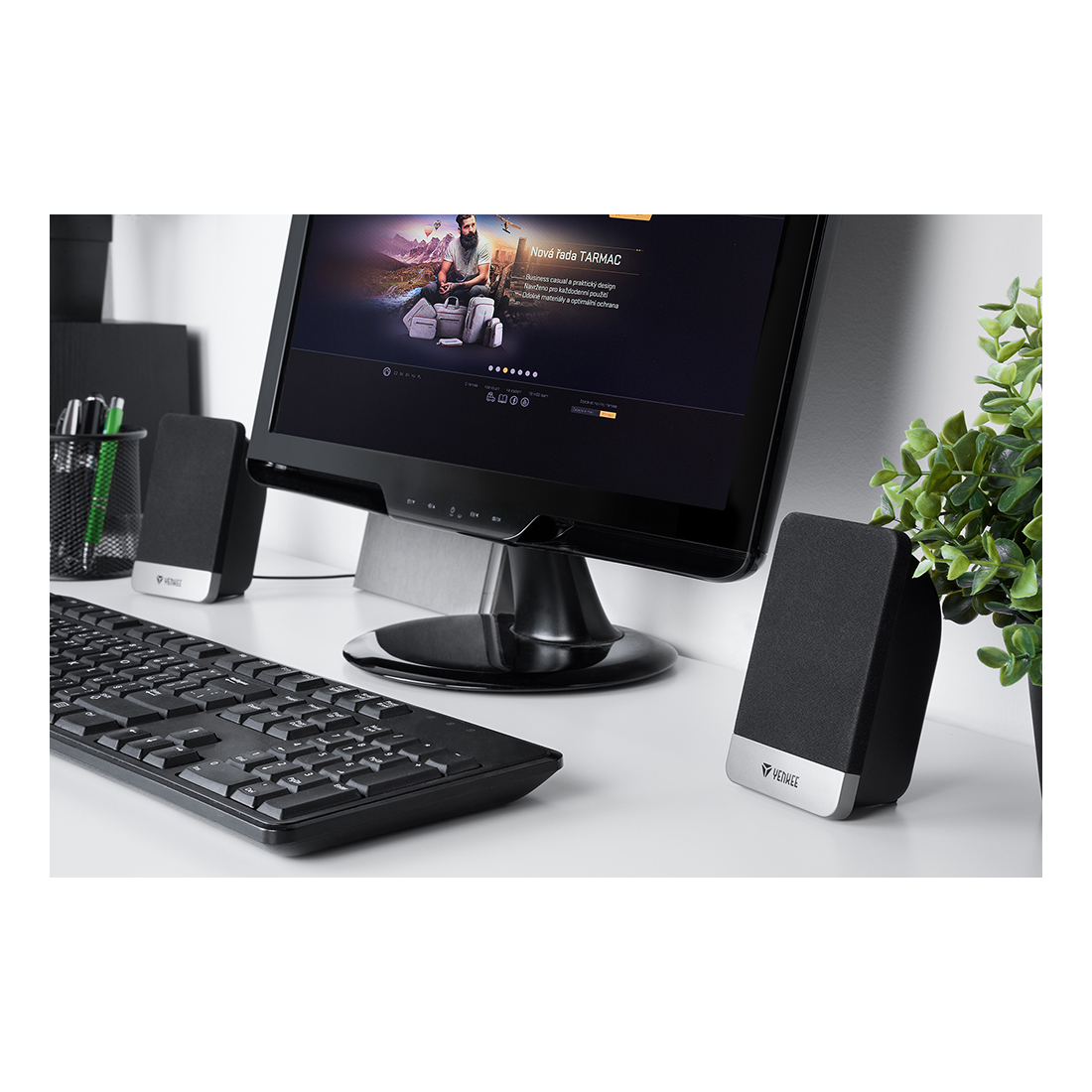 Kompaktowe wymiary umożliwiają umieszczenie głośników satelitarnych na biurku obok monitora lub notebooka, przy zachowaniu przestrzeni do pracy.
