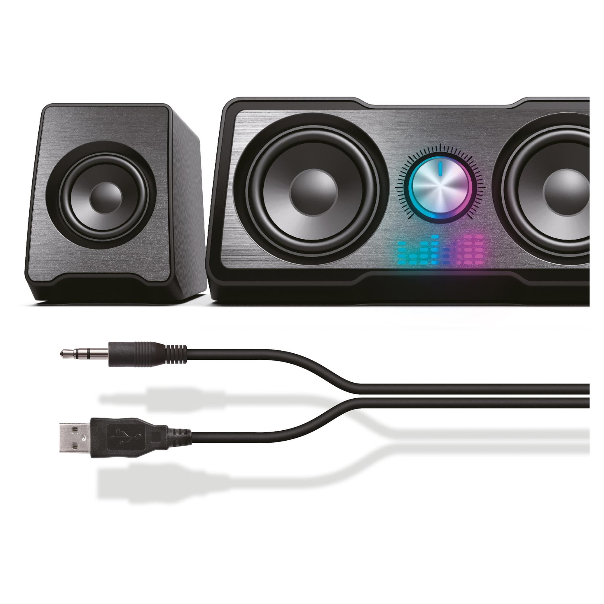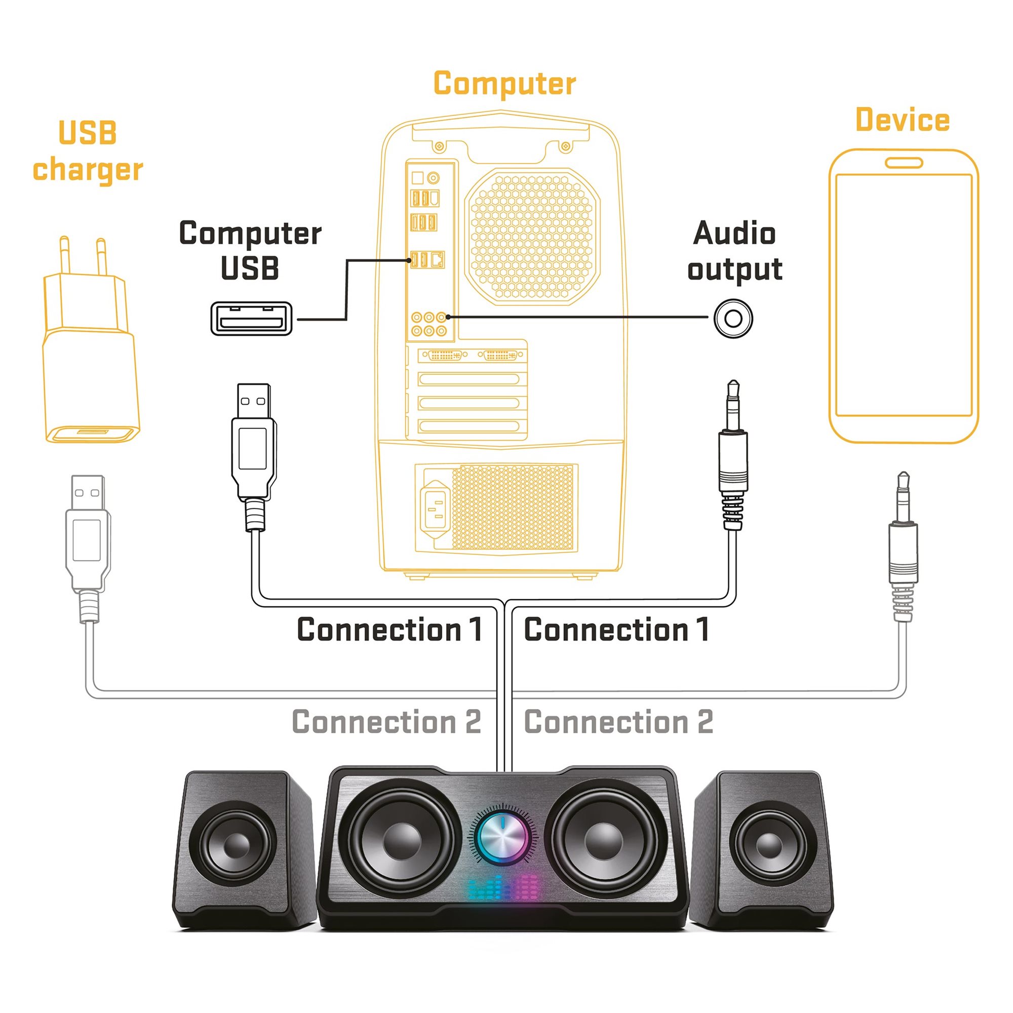 Moją największą zaletą jest prosta obsługa, z którą poradzi sobie nawet dziecko. Dźwięk wysokiej jakości jest dostarczany przez złącze audio 3,5 mm, które wystarczy podłączyć do gniazda w komputerze. Podobnie jest z regulacją głośności, którą steruje się za pomocą dużego pokrętła umieszczonego z przodu głośnika niskotonowego. Zasilanie zapewnia kabel USB łączący głośniki z komputerem. Podłącz więc wtyczkę i ciesz się muzyką!